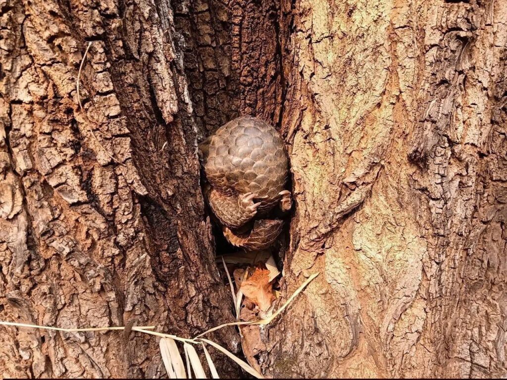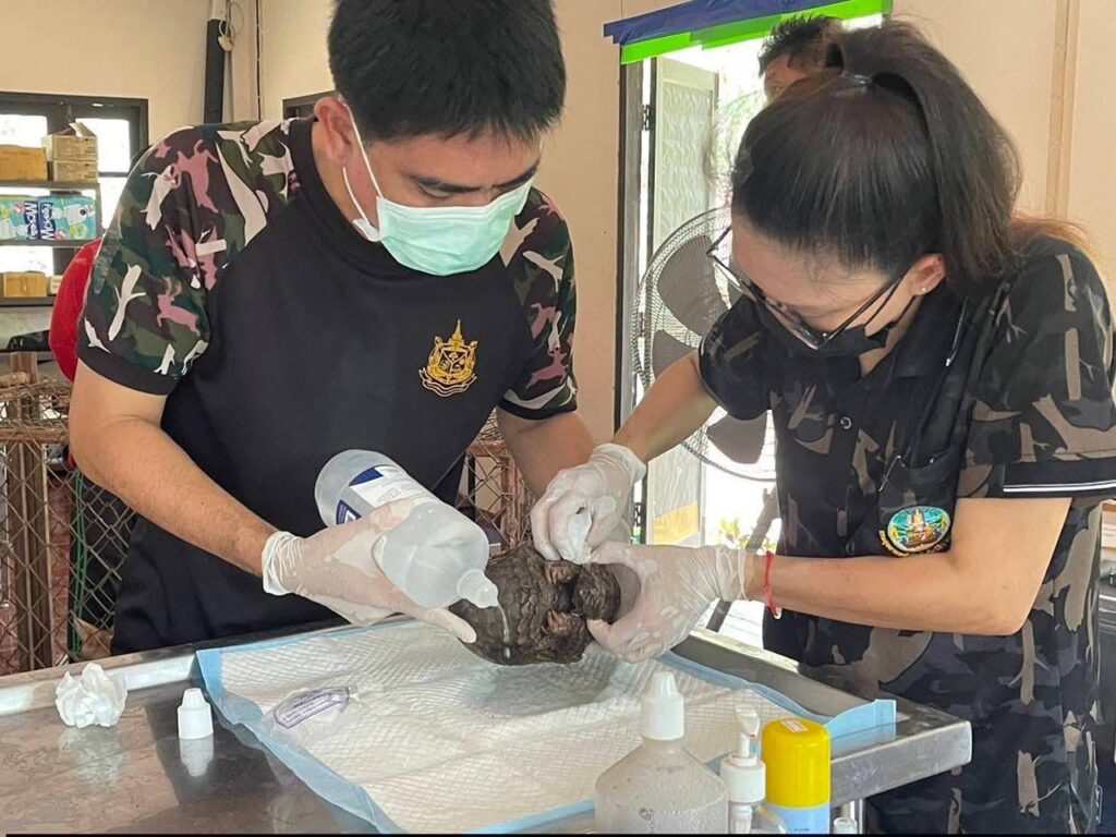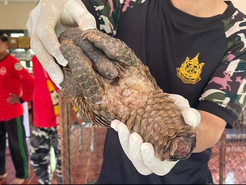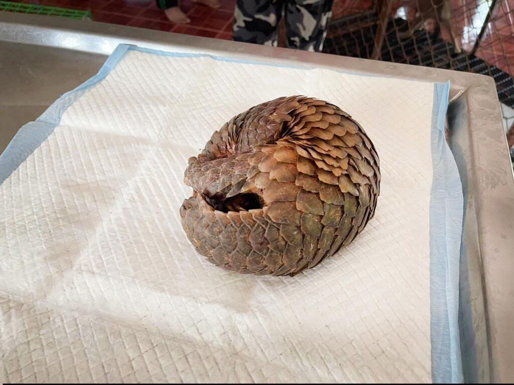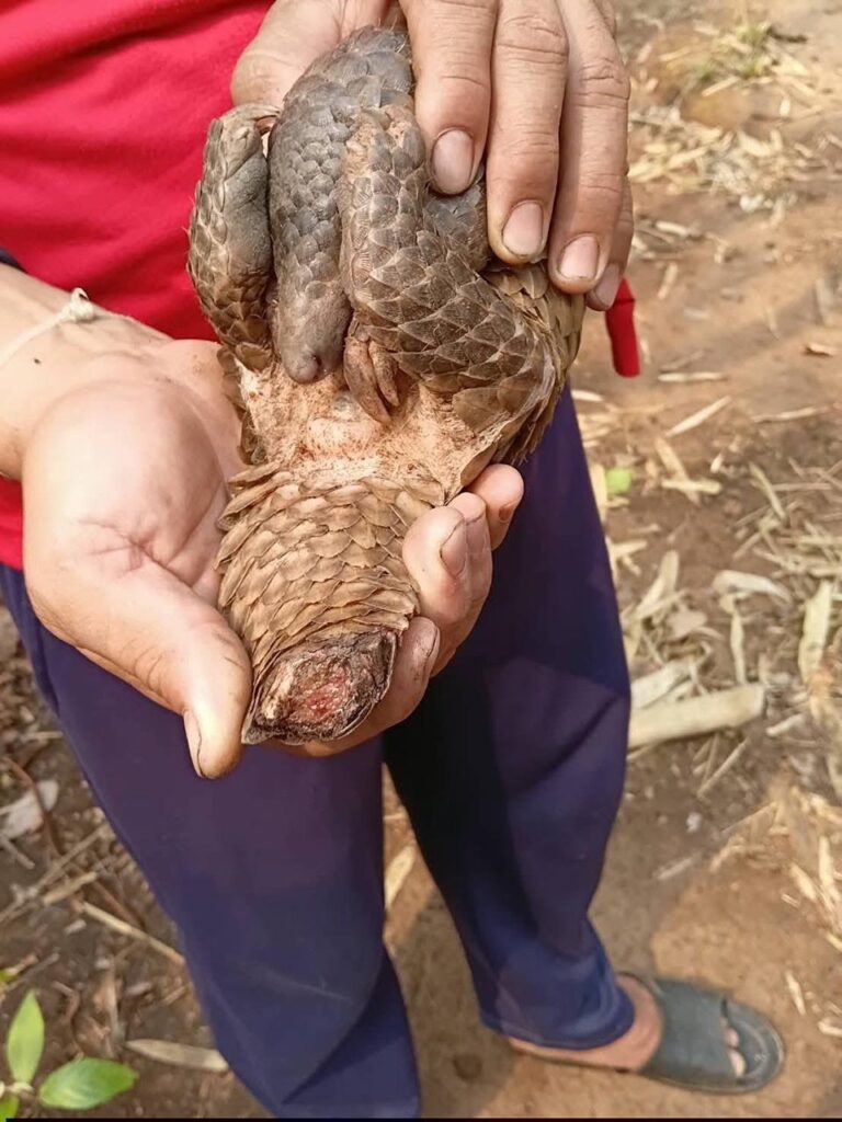 จุดเกิดเหตุบริเวณทิศตะวันตกของวัดป่าถ้ำวัว ขณะเจ้าหน้าที่กำลังดับไฟป่า พบตัวลิ่นเพศเมียมีอาการอ่อนแรงอย่างหนัก นอนหอบหนีความร้อนอยู่ในซอกไม้ เกล็ดบริเวณกลางหลังแตกผิดรูปจากความร้อน หางกุดแหว่งคล้ายถูกของมีคมตัด ซึ่งเป็นบาดแผลที่เกิดจากทั้งน้ำมือมนุษย์และไฟป่าที่ลุกลาม ทีมสัตวแพทย์สถานีเพาะเลี้ยงสัตว์ป่าปางตองเข้าดูแลทันที โดยทำการล้างแผล ป้องกันการติดเชื้อ และเฝ้าระวังอาการช็อกอย่างใกล้ชิด