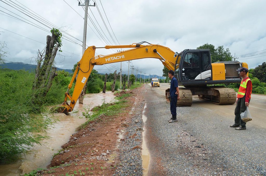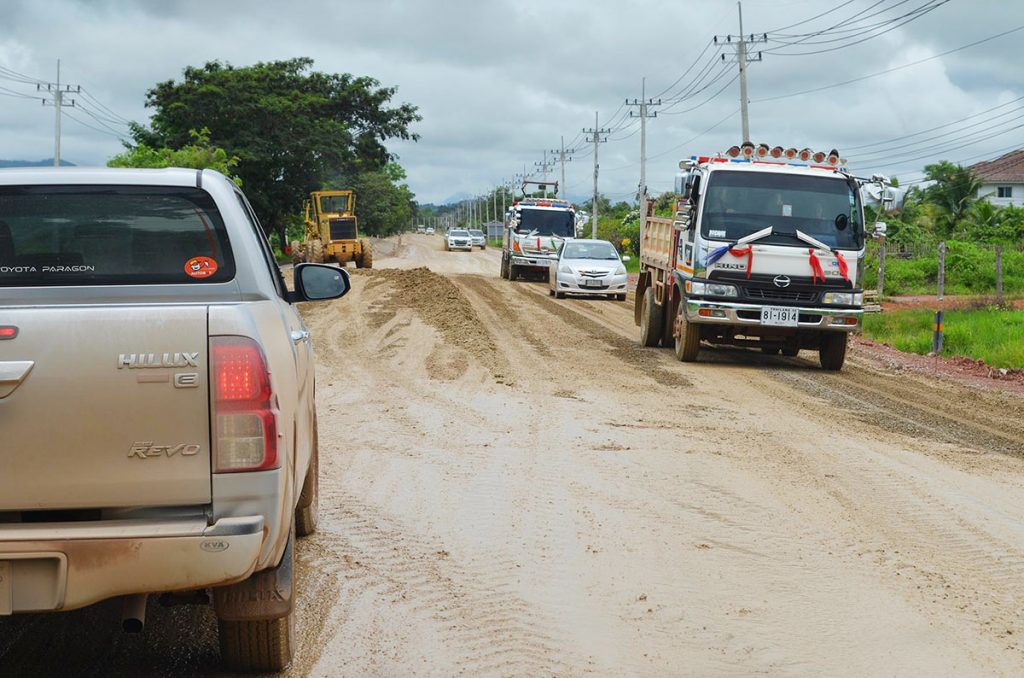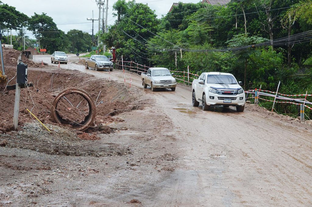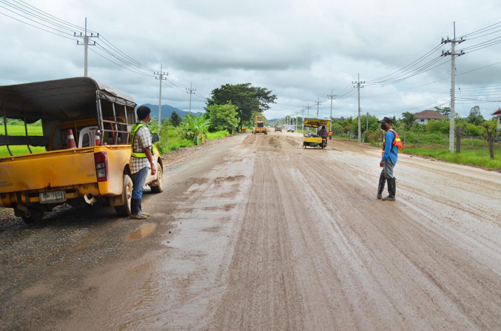 ผู้สื่อข่าวรายงานว่า ตลอดระยะทาง 6.400 กม.ผิวถนนไม่ต่างกับเลน รถยนต์แต่ละคันต้องขับด้วยความระมัดระวังใช้ความเร็วประมาณ 20+40 กม.ชม.ระหว่างทางพบทีมงานก่อสร้างถนนกำลังนำรถเกรด มาทำการปรับเกรดผิวดินที่ลื่นเละให้ถึงพื้นดินที่แข็งเพื่อให้รถยนต์สัญจรได้สะดวก หัวหน้าคนงาน ขอสงวนชื่อ บอกว่า โครงการนี้ต้องเริ่มทำตั้งแต่เดือนตุลาคม 2564 แล้ว แต่ติดปัญหาเรื่องต้นไม้สองข้างทางเดิม จึงทำให้เกิดความล่าช้าไปถึง 4 เดือน พอเราลงมือทำได้ช่วง ก.พ.65 จึงต้องมาเจอฝนทำให้เกิดความล่าช้าลงไปอีก ซึ่งนอกจากแก้ปัญหาฝนตกหนักหินคลุกถูกน้ำเซาะลงข้างทางแล้ว เรายังต้องช่วยเหลือชาวบ้าน เพราะน้ำป่าไหลหลากเข้าท่วมโรงเรียนบ้านธาตุขิงแกง ด้วยการนำรถแบคโฮไปขุดเปิดทางให้น้ำไหลลงทุ่งนาได้สะดวกป้องกันน้ำท่วมขังอีกด้วย