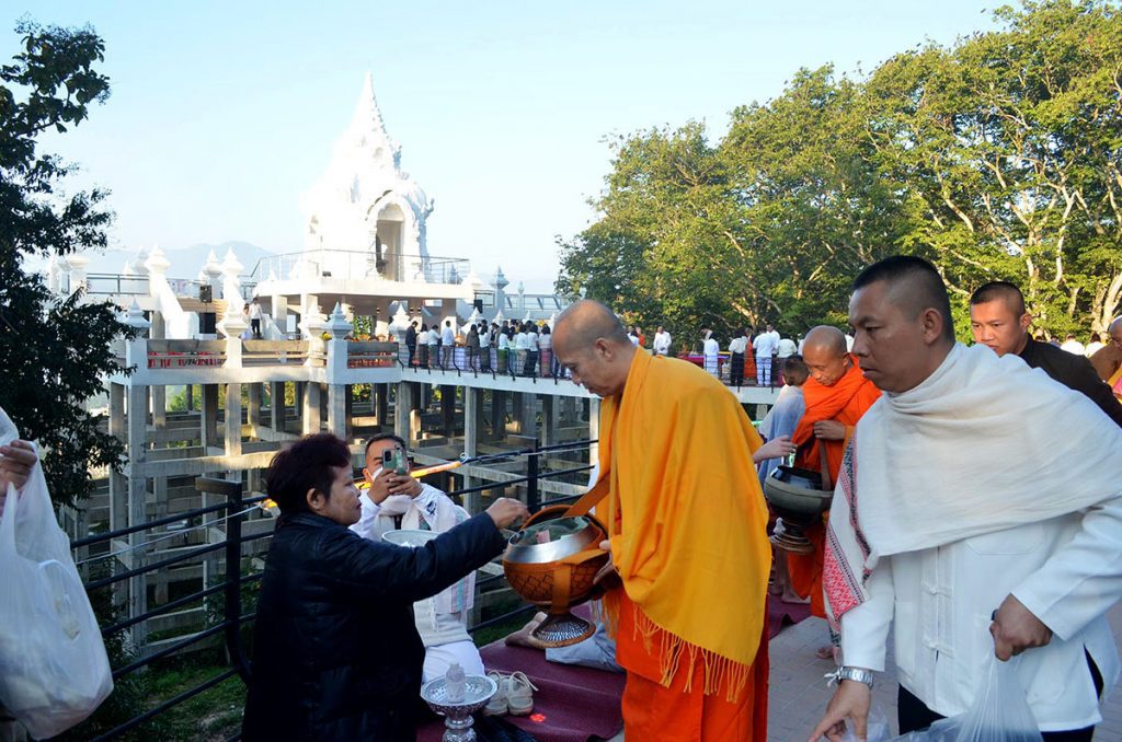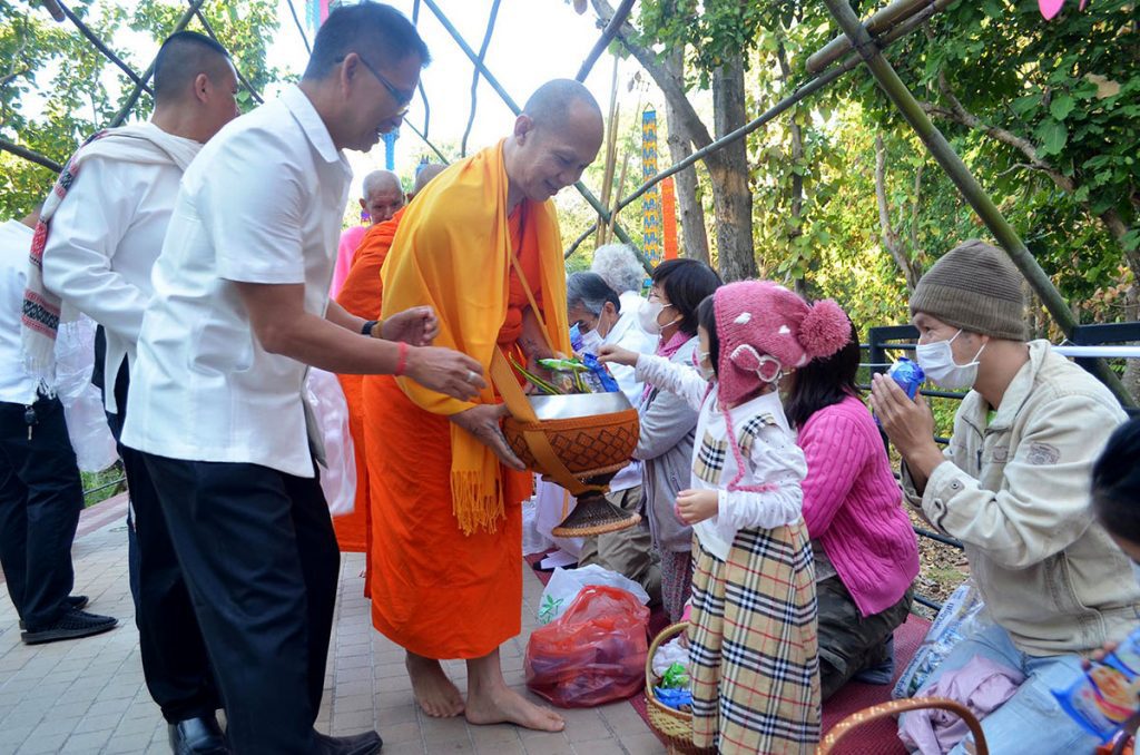 โดย พระราชประริยัติ เจ้าคณะจังหวัดพะเยา เจ้าอาวาสวัดศรีโคมคำ พระอารามหลวง เป็นประธานสงฆ์ ประกอบพิธีเจริญพระพุทธมนต์ พร้อมกล่าวสัมโมทนียคถา ให้พรแก่พุทธศาสนิกชนเนื่องในวันขึ้นปีใหม่ ขออำนาจบารมีองค์พระธาตุจอมทอง ได้โปรดอภิบาลบันดาลดล ปกปักรักษา ปกป้องคุ้มครองให้ท่านสาธุชนทั้งหลายมั่งมีศรีสุข มั่งคั่งปลอดภัยและเจริญรุ่งเรื่อง แคล้วคาดปลอดภัย ไม่อดไม่อยาก ไม่ยากไม่จน ไม่ต่ำกว่าคน ไม่จนกว่าใคร มีกินมีใช้ มีไว้มีเก็บ ใกล้ไกลไปรอดตลอดปลอดภัยทุกท่านทุกคนเทอญ จากนั้นพระราชปริยัติ ได้นำคณะสงฆ์จำนวน 67 รูป เดินรับบาตรจาก นายรัฐพล วราดิศร ผวจ.พะเยา และเดินรับบาตรจากผู้มีจิตศรัทธาร่วมทำบุญ ตามแนวทางเดินของสกายวอล์คจนสุดทาง