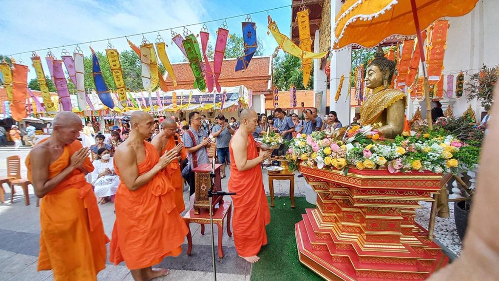 นักท่องเที่ยวกราบไหว้ รดน้ำขอพร พระเจ้าตนหลวง สูมาคารวะพระเถระ เพื่อความเป็นสิริมงคล ก่อนเดินทางกลับหลังจากเล่นน้ำสงกรานต์ชุ่มฉ่ำ
