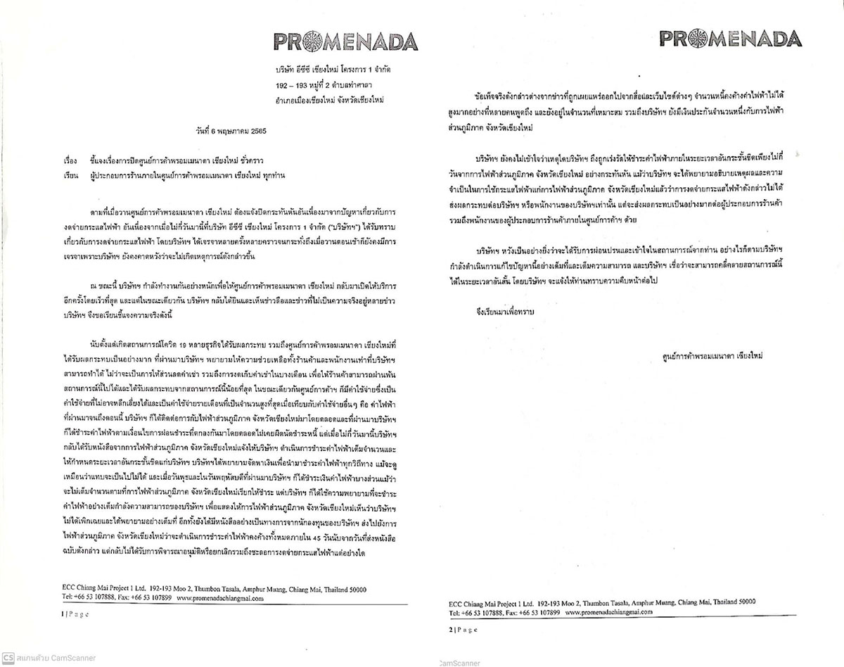 ขณะเดียวกัน ทางด้านศูนย์การค้าพรอมเมนาดา เชียงใหม่ ได้ออกหนังสือ ชี้แจงเรื่องการปิดศูนย์การค้าพรอมเมนาดา เชียงใหม่ ชั่วคราว ถึงผู้ประกอบการร้านกายในศูนย์การค้าพรอมเมนาดา เชียงใหม่ ทุกท่าน ตามที่เมื่อวานศูนย์การค้าพรอมเมนาดา เชียงใหม่ ต้องแจ้งปิดกระทันหันอันเนื่องมาจากปัญหาเกี่ยวกับการงดจ่ายกระแสไฟฟ้า อันเนื่องจากเมื่อไม่กี่วันมานี้ที่บริษัท อีซีซี เชียงใหม่ โครงการ 1 จำกัด (“บริษัทฯ”) ได้รับทราบเกี่ยวกับการงดจ่ายกระแสไฟฟ้า โดยบริษัทฯ ได้เจรจาหลายครั้งหลายคราวจนกระทั่งถึงเมื่อวานตอนเช้าก็ยังคงมีการเจรจาเพราะบริษัทฯ ยังดงดาดหวังว่าจะไม่เกิดเหตุการณ์ดังกล่าวขึ้น ณ ขณะนี้ บริษัทฯ กำลังทำงานกันอย่างหนักเพื่อให้ศูนย์การค้าพรอมเมนาดา เชียงใหม่ กลับมาเปิดให้บริการอีกครั้งโดยเร็วที่สุด และแต่ในขณะเดียวกัน บริษัทฯ กลับได้ยินและเห็นข่าวลือและข่าวที่ไม่เป็นความจริงอยู่หลายข่าว บริษัทฯ จึงขอเรียนชี้แจงความจริงดังนี้ นับตั้งแต่เกิดสถานการณ์โควิด 19 หลายธุรกิจได้รับผลกระทบ รวมถึงศูนย์การค้าพรอมเมนาดา เชียงใหม่ที่ได้รับผลกระทบเป็นอย่างมาก ที่ผ่านมาบริษัทฯ พยายามให้ความช่วยเหลือทั้งร้านค้าและพนักงานเท่าที่บริษัทฯ สามารถทำได้ ไม่ว่าจะเป็นการให้ส่วนลดค่าเช่า รวมถึงการงดเก็บค่าเช่าในบางเดือน เพื่อให้ร้านค้าสามารถผ่านพ้นสถานการณ์นี้ไปได้และได้รับผลกระทบจากสถานการณ์นี้น้อยที่สุด ในขณะเดียวกันศูนย์การค้าฯ ก็มีค่าใช้จ่ายซึ่งเป็นค่าใช้จ่ายที่ไม่อาจหลีกเลี่ยงได้และเป็นค่าใช้จ่ายรายเดือนที่เป็นจำนวนสูงที่สุดเมื่อเทียบกับค่าใช้จ่ายอื่นๆ คือ ค่าไฟฟ้าที่ผ่านมาจนถึงตอนนี้ บริษัทฯ ก็ได้ติดต่อการกับไฟฟ้าส่วนภูมิภาค จังหวัดเชียงใหม่มาโดยดลอดและที่ผ่านมาบริษัทฯ ก็ได้ชำระค่าไฟฟ้าตามเงื่อนไขการผ่อนชำระที่ตกลงกันมาโดยตลอดไม่เคยผิดนัดชำระหนี้