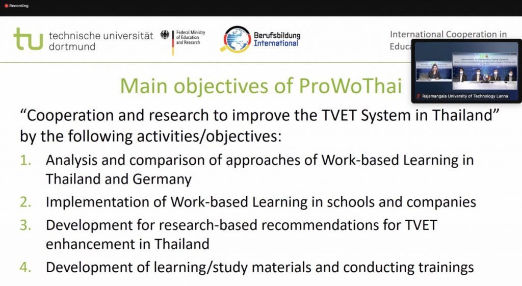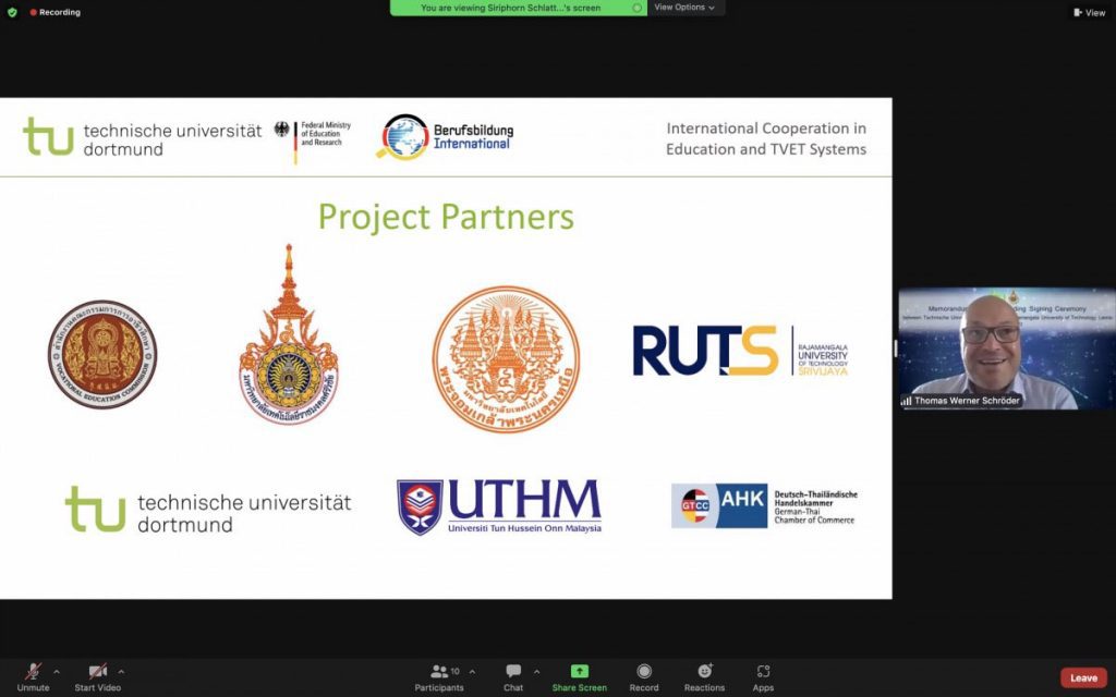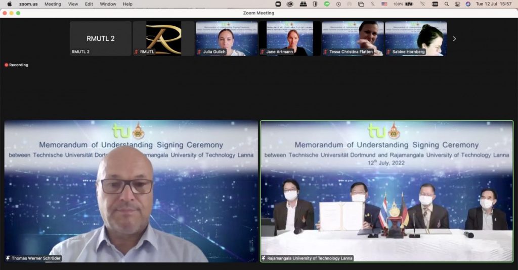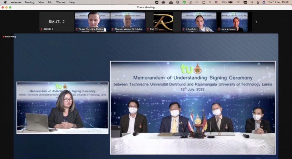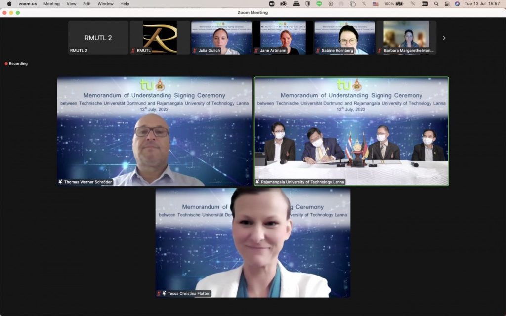 วันที่ 12 กรกฎาคม 2565 มหาวิทยาลัยเทคโนโลยีราชมงคลล้านนา ลงนามบันทึกความเข้าใจ (MOU) ร่วมกับ Tu Dortmund University ประเทศเยอรมนี ผ่านระบบออนไลน์ Zoom Meeting ในการต่ออายุความร่วมมือทางวิชาการเพื่อดำเนินงานพัฒนาการศึกษาด้านอาชีวะและเทคโนโลยีศึกษา ภายใต้โครงการวิจัยร่วมระดับนานาชาติ “Progressing Work-based Learning of TVET Systems in Thailand (ProWoThai)” โดย ผู้ช่วยศาสตราจารย์ ดร.จัตตุฤทธิ์ ทองปรอน รักษาราชการแทนอธิการบดี พร้อมด้วย รศ.ธีระศักดิ์ อุรัจนานนท์ รองอธิการบดีฝ่ายวิชาการและกิจการนักศึกษา มหาวิทยาลัยเทคโนโลยีราชมงคลล้านนา เป็นผู้ลงนาม ร่วมกับ Prof.Dr.Tessa Flatten รองอธิการบดีผฝ่ายวิเทศสัมพันธ์ พร้อมด้วย Prof.Dr.Sabine Hornberg คณบดีคณะศึกษาศาสตร์ จิตวิทยาและการวิจัยด้านการศึกษา TU Dortmund โดยมี ดร.กิจจา ไชยทนุ คณบดีคณะวิศวกรรมศาสตร์ ร่วมเป็นสักขีพยานในการลงนาม