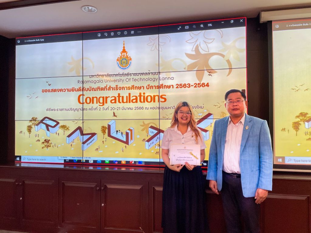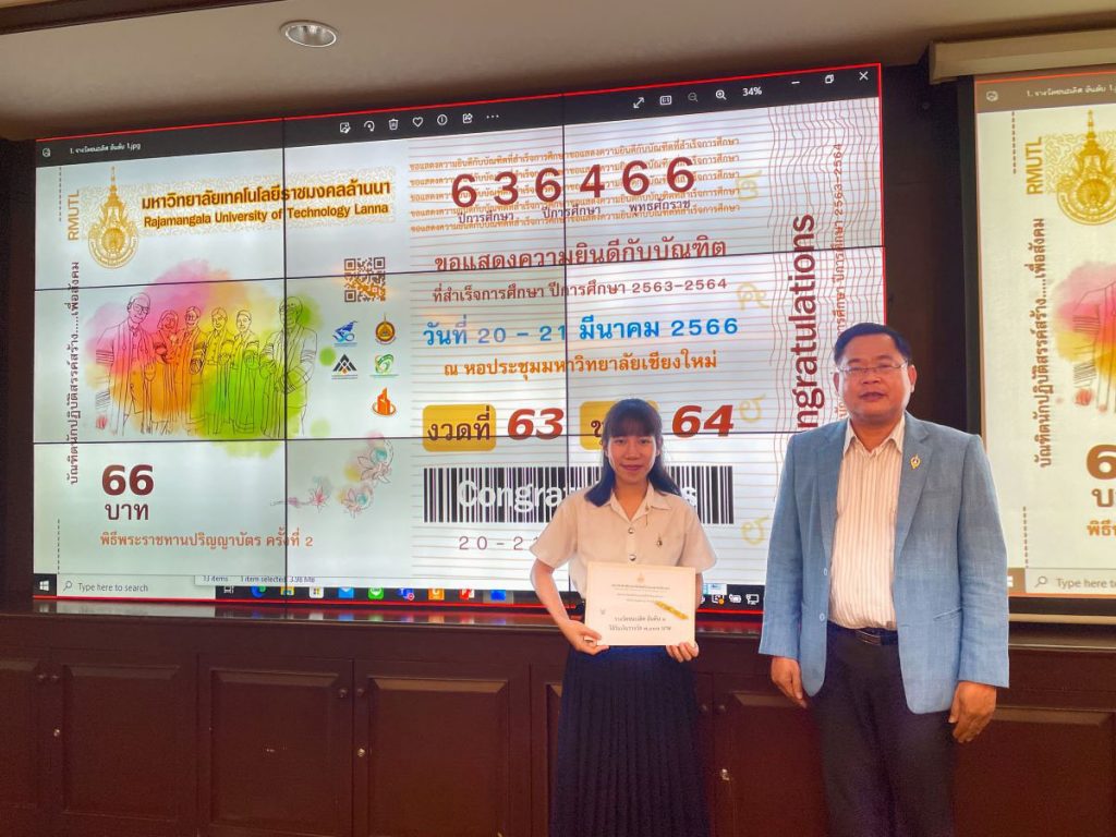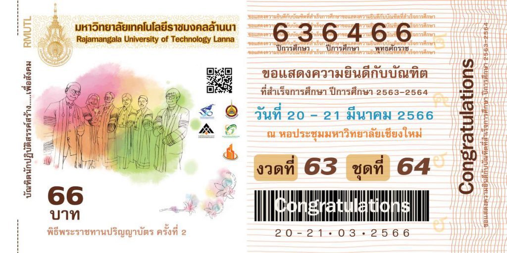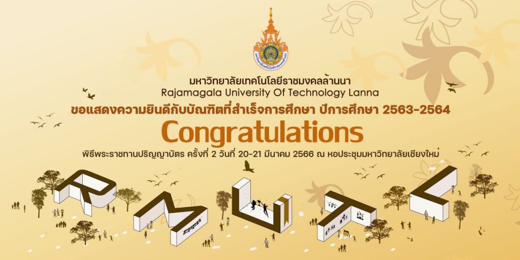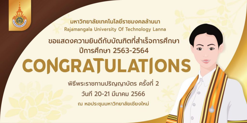 มหาวิทยาลัยเทคโนโลยีราชมงคลล้านนา จะมีพิธีมอบปริญญาแก่ผู้สำเร็จการศึกษาประจำปีการศึกษา2563 และ 2564 ระหว่างวันที่ 20 – 21 มีนาคม 2566 ณ หอประชุมมหาวิทยาลัยเชียงใหม่ โดยผลงานการออกแบบป้ายแสดงความยินดีทั้ง 3 ผลงานจะนำมาติดตั้งในจุดประชาสัมพันธ์ต่อไป
