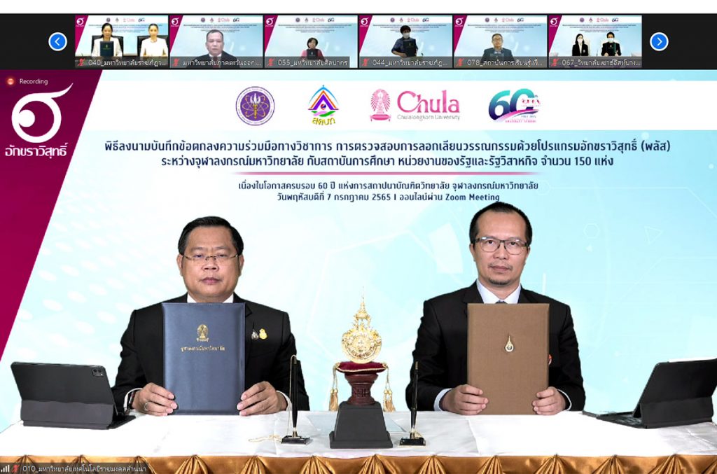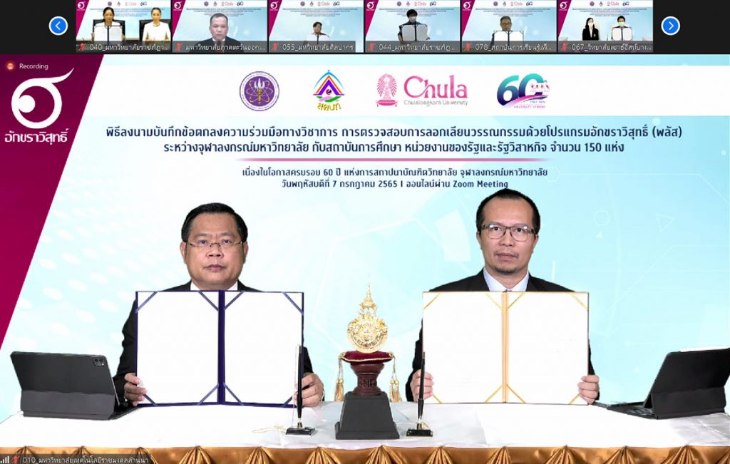 วันที่ 7 กรกฎาคม 2565 ผู้ช่วยศาสตราจารย์ ดร.จัตตุฤทธิ์ ทองปรอน รักษาราชการแทนอธิการบดี มหาวิทยาลัยเทคโนโลยีราชมงคลล้านนา ลงนามความร่วมมือ ร่วมกับจุฬาลงกรณ์มหาวิทยาลัย โดย รองศาสตราจารย์ ดร.ยุทธนา ฉัพพรรณรัตน์ คณบดีบัณฑิตวิทยาลัย พร้อมทั้งหน่วยงานภาครัฐและรัฐวิสาหกิจอีก 15 แห่ง เนื่องในโอกาสครบรอบ 60 ปีแห่งการสถาปนาบัณฑิตวิทยาลัย จุฬาลงกรณ์มหาวิทยาลัย รูปแบบออนไลน์ ผ่านระบบ Zoom meeting เพื่อร่วมเป็นเครือข่ายในการตรวจสอบและป้องปรามมิให้มีการกระทำอันเป็นการลอกเลียนงานวรรณกรรมของบุคคลอื่น โดยจุฬาลงกรณ์มหาวิทยาลัยอนุญาตให้ มทร.ล้านนา Click here to enter text. มีสิทธิใช้โปรแกรมคอมพิวเตอร์ที่ชื่อว่า “อักขราวิสุทธิ์” ซึ่งเป็นโปรแกรมคอมพิวเตอร์สำหรับใช้ในการตรวจสอบการลอกเลียนงานวรรณกรรมได้โดยไม่คิดมูลค่าและ มีสิทธิใช้และเข้าถึงฐานข้อมูลต่าง ๆ เช่น วิทยานิพนธ์ สารนิพนธ์ รายงานวิจัย วารสารและเอกสารอิเล็กทรอนิกส์ อื่น ๆ เป็นต้น ที่จุฬาฯ เป็นเจ้าของ หรือมีสิทธิที่จะอนุญาตให้ มทร.ล้านนา ใช้และเข้าถึงได้โดยไม่คิดค่าใช้จ่าย