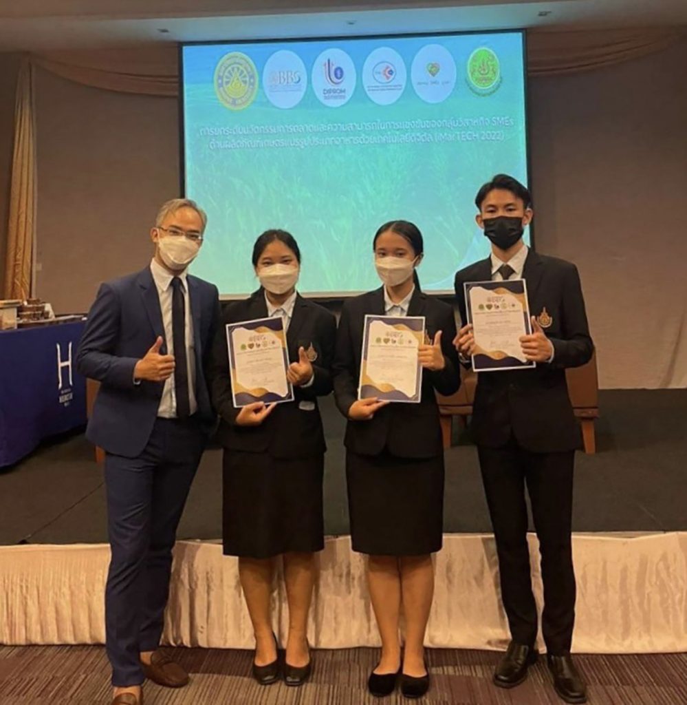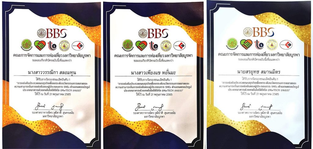 โดยมี อาจารย์​ อิศ​ร์​ วัจนสุนทร อาจารย์​ประจำ​หลักสูตร​การ​ท่องเที่ยว​และการ​บริการ​ เป็นอาจารย์​ที่​ปรึกษา​ และนำนักศึกษา​ร่วมในพิธีประกาศ​ผล ซึ่งงานในครั้งนี้ได้รับเกียรติ​จาก รศ.ดร.ถิรวัฒน์ แจ่มกระจ่าง รองประธานอาวุโสและที่ปรึกษา​สภาวิสาหกิจ​ขนาด​กลาง​และ​ขนาด​ย่อ​มไทย เป็นผู้มอบรางวัล เมื่อวันเสาร์ที่ 21 พฤษภาคม 2565 ณ โรงแรม​บางแสนเฮอริเทจ อ.เมือง จ.ชลบุรี