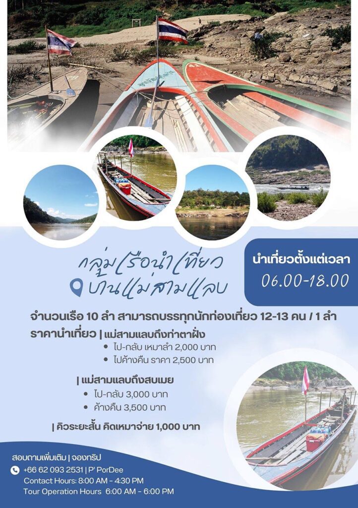 วันที่ 7 ธันวาคม 2568 กลุ่มเรือนำเที่ยวบ้านแม่สามแลบ เปิดเส้นทางการท่องเที่ยวล่องเรือลำน้ำสาละวิน โดยมีเรือไว้คอยบริการนักท่องเที่ยว 10 ลำ สามารถบรรทุกนักท่องเที่ยวได้ 12-13 คน / 1 ลำ สำหรับเส้นทางการท่องเที่ยวแบ่งเป็น 2 เส้นทาง คือ เส้นทางที่ 1 ล่องเรือลงใต้ จุดหมายที่สบเมย ซึ่งเป็นบริเวณที่แม่น้ำเมยมาบรรจบแม่น้ำสาละวิน เป็นแม่น้ำสองสี การเดินทางไปกลับ เหมาลำ 3,000 บาท กรณีค้างคืน ราคา 3,500 บาท ส่วน เส้นทางที่ 2 ล่องเรือขึ้นไปทางเหนือ จนถึงบ้านท่าตาฝั่ง ล่องเรือไป-กลับ 2,500 บาท กรณีค้างคืน 2,500 บาท ส่วนคิวระยะสั้นคิดเหมาจ่าย 1,000 บาท นำเที่ยวล่องเรือน้ำสาละวิน ตั้งแต่เวลา 06.00 น.- 18.00 น. ติดต่อสอบถาม จองทริปล่องเรือสาละวิน และ ที่พักในพื้นที่ได้ ที่ 062-093-2531 P’PorDee