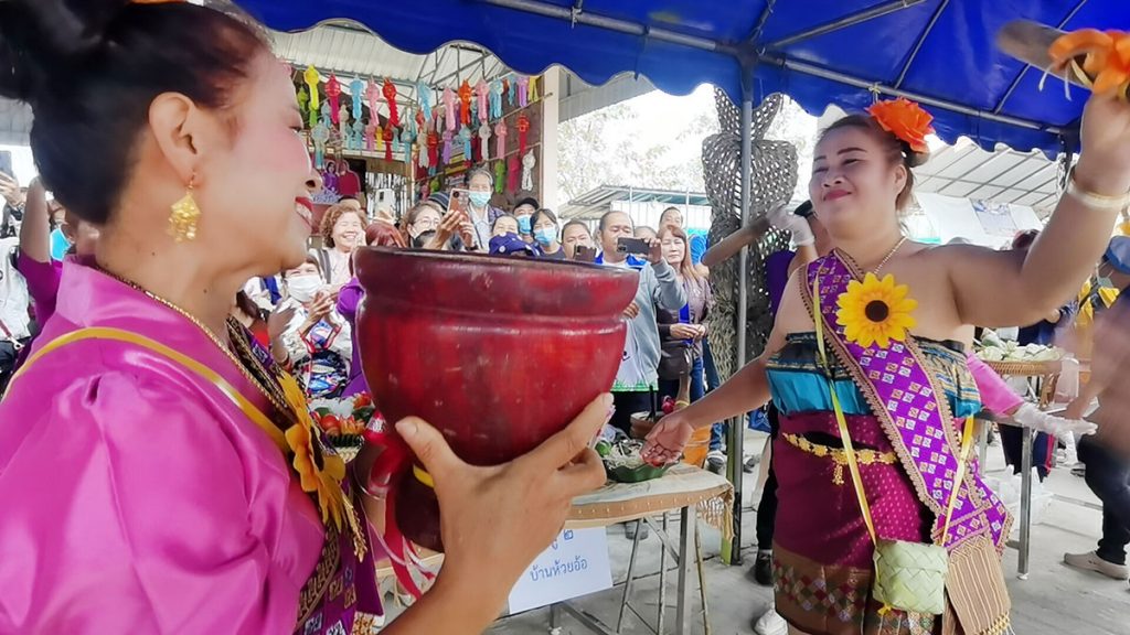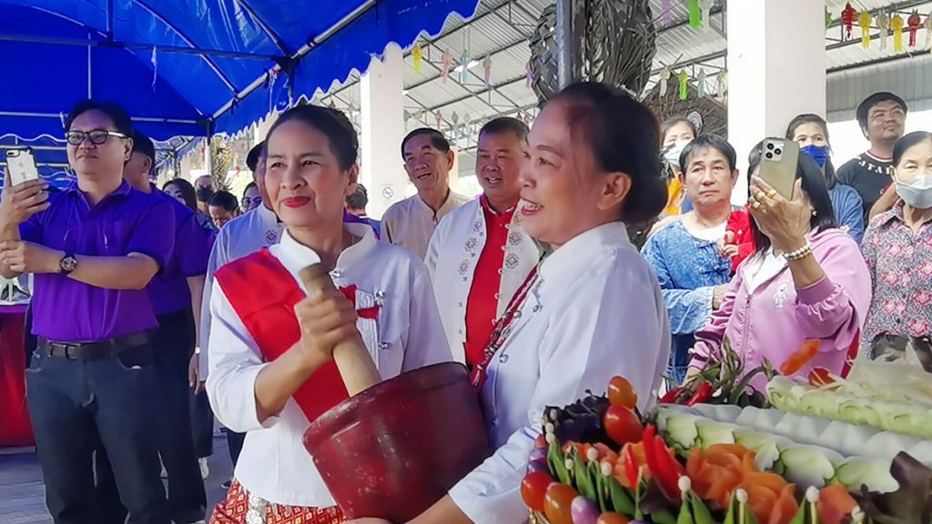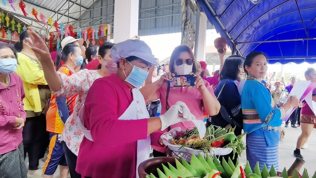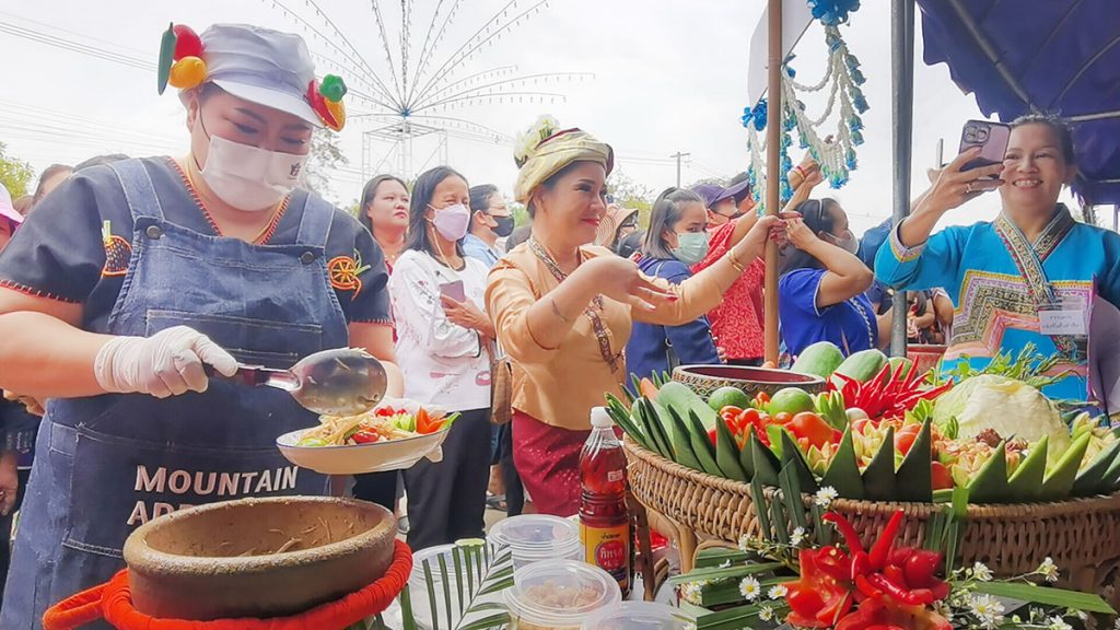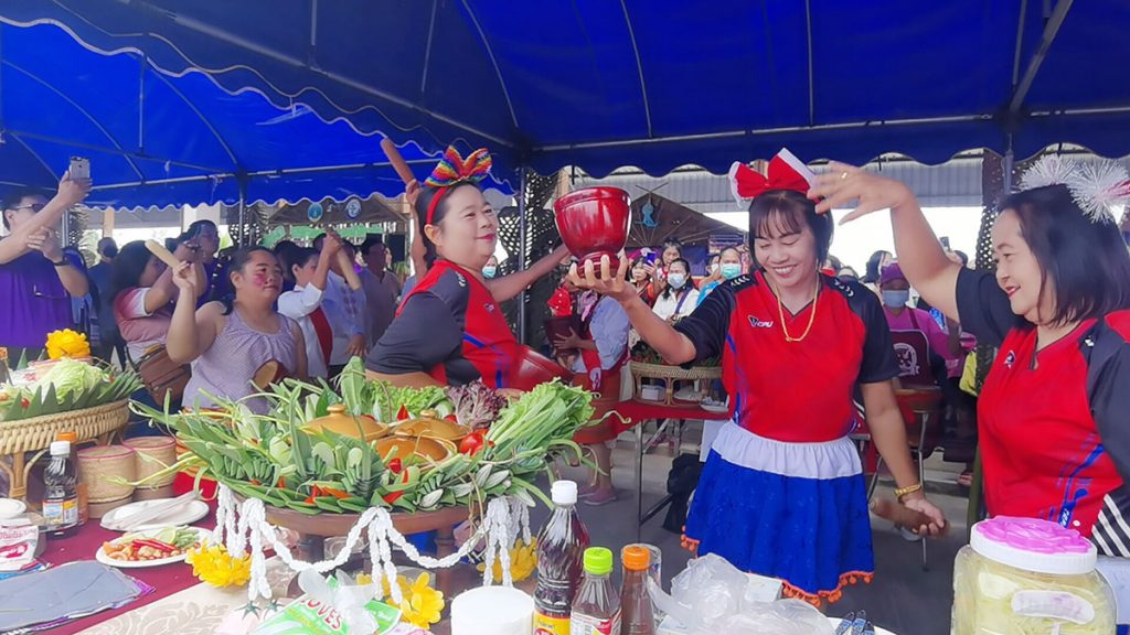 วันที่ 27 ม.ค. 67 ภาพบรรยากาศการแข่งขันส้มตำลีลา จากชาวบ้าน 17 หมู่บ้านของที่อยู่ในตำบลน้ำดิบ อำเภอป่าซาง จังหวัดลำพูน ซึ่งมาแข่งขันส้มตำลีลา ภายในการจัดงานโครงการวิถีชีวิตคนตำบลน้ำดิบ กับไก่เหล่าป่าก๋อย ครั้งที่ 7 ประจำปี 2567 มีการประกวดตั้งแต่เครื่องแต่งกายประเภททีม การเต้น การตกแต่งจาน และรสชาติของส้มตำปูปาร้า แต่ละคนแต่งกายออกมาประชันกันเรียกว่าไม่มีใครยอมใคร กระทั่งคณะกรรมการได้เปิดเพลงให้เต้น จำนวน 2 เพลง ทั้งเพลงของส้มตำ ของพุ่มพวง ดวงจันทร์ และเพลงเต่างอย ของจินตหรา พูนลาภ บางคนโชว์ลีลาโยนสาก โยนครก บางคนเต้นจนล้มแต่ก็ลุกขึ้นมาเต้นต่อ สร้างเสียงฮือฮา และความสนุกสนานให้กับผู้เข้าร่วมงานเป็นจำนวนมาก