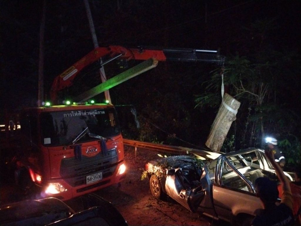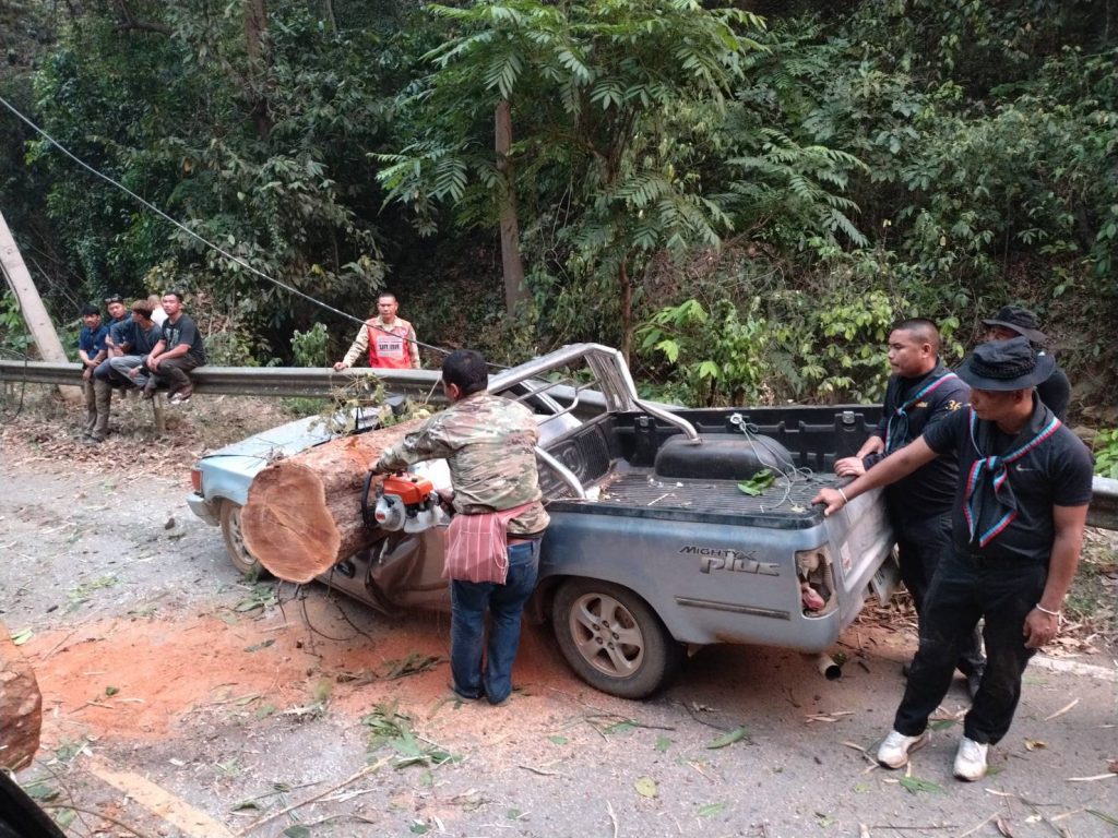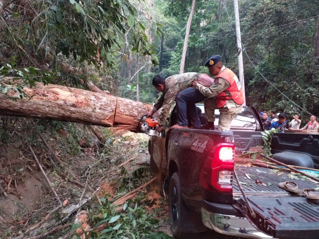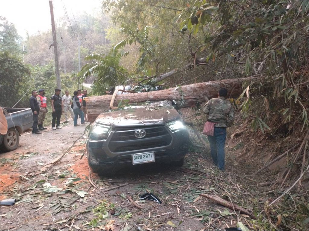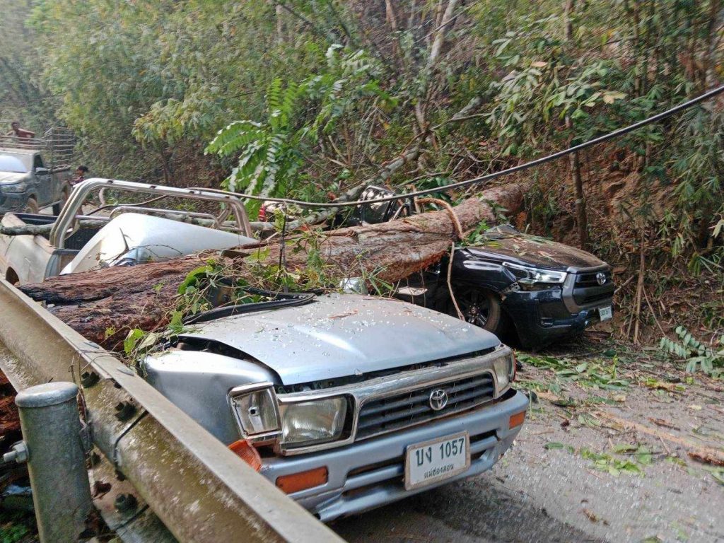 อำเภอสบเมย เร่งช่วยเหลือชาวบ้าน หลังเจอเหตุไม่คาดคิด ต้นไม้และเสาไฟฟ้าล้มทับรถยนต์เสียหาย 2 คันพังยับ เดชะบุญคนขับปลอดภัย