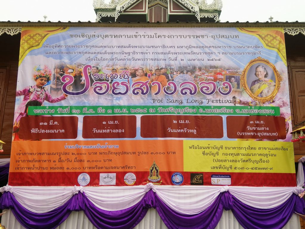 วันที่ 1 เมษายน 2565 ลานบุญ ลานปัญญา วัดศรีบุญเรือง อ.แม่สะเรียง จ.แม่ฮ่องสอน พลเรือเอก พิเชฐ ตานะเศรษฐ คณะทำงานรองนายกรัฐมนตรี (พลเอก ประวิตร วงษ์สุวรรณ) เป็นประธานในพิธี โครงการบรรพชาสามเณร และอุปสมบทพระภิกษุปอยส่างลอง จำนวน 22 คน เตรียมบวชเป็นพระ 5 และ บวชเป็นสามเณร 17 คน เพื่ออุทิศถวายพระราชกุศลแด่พระบาทสมเด็จพระบรมชนกาธิเบศร มหาภูมิพลอดุลยเดชมหาราช บรมนาถบพิตร และถวายพระราชกุศลแด่สมเด็จพระกนิษฐาธิราชเจ้า กรมสมเด็จพระเทพรัตนราชสุดา ฯ สยามบรมราชกุมารี เนื่องในวันคล้ายวันพระราชสมภพ วันที่ 2 เมษายน 2565 โดยมีนายมนตรี บำรุงกิจ นายกเทศมนตรีตำบลแม่สะเรียง เป็นผู้กล่าวรายงาน ประเพณีปอยส่างลอง ประจำปี 2565 ณ วัดศรีบุญเรือง กำหนดจัดขึ้นระหว่างวันที่ 31 มีนาคม – วันที่ 3 เมษายน 2565 ซึ่งจัดขึ้น โดยการสนับสนุนของสำนักงานวัฒนธรรมจังหวัดแม่ฮ่องสอน และความร่วมมือจากสภาวัฒนธรรมจังหวัดแม่ฮ่องสอน วัดศรีบุญเรือง และ โรงเรียนพระปริยัติธรรมธีรราชมหามุนี