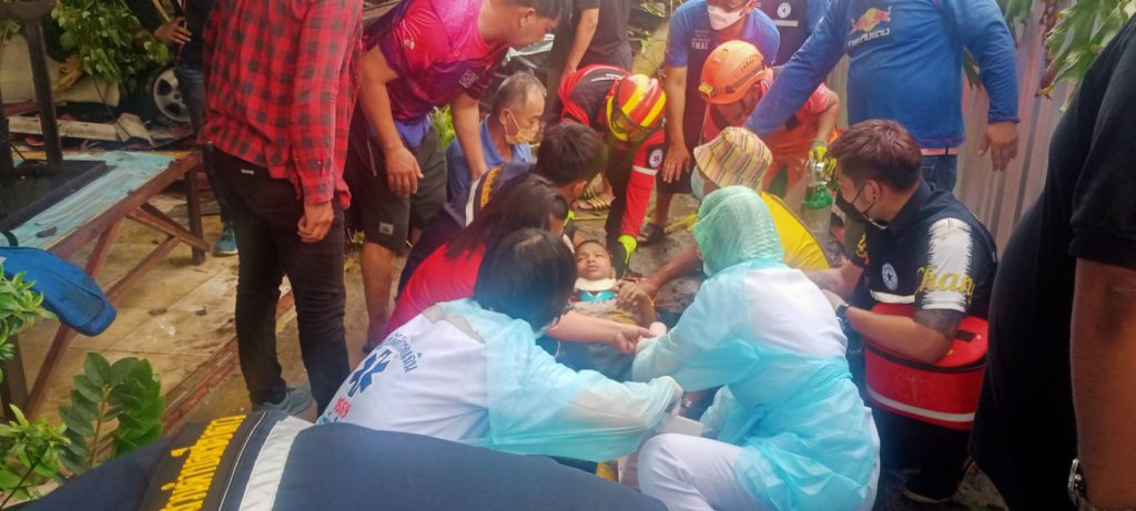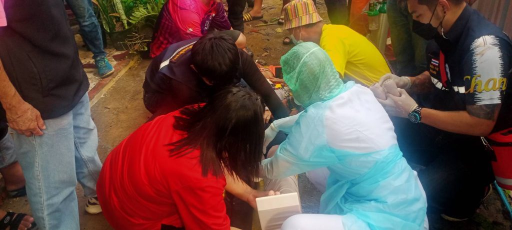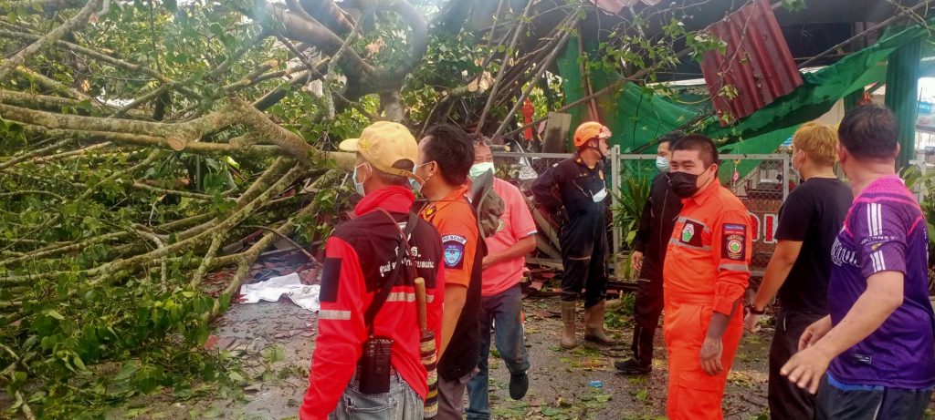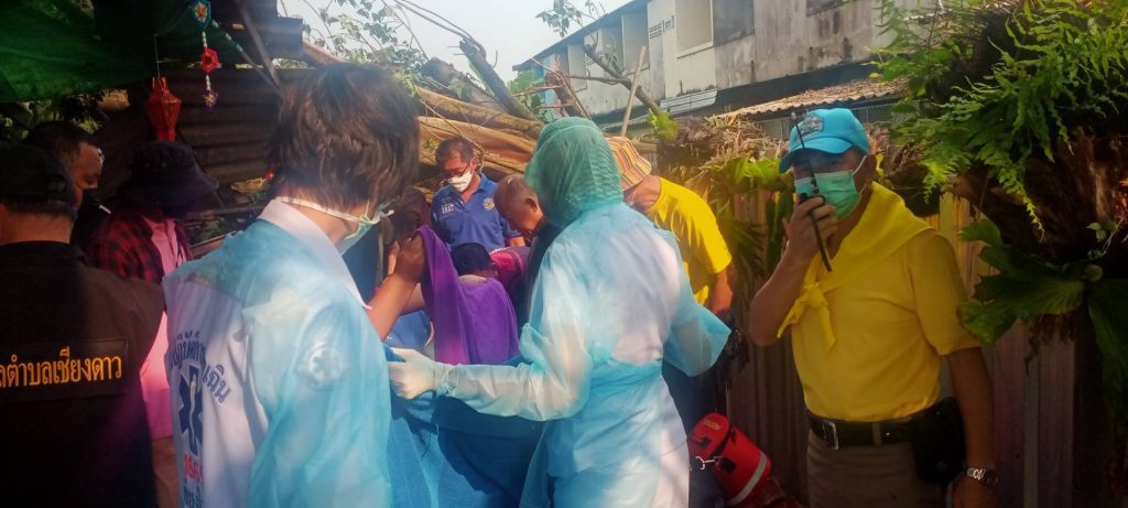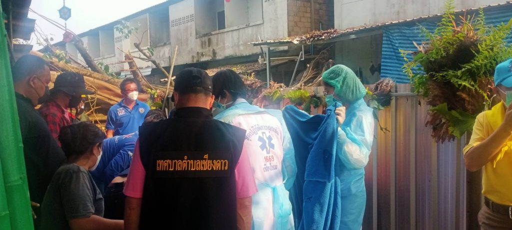 จากการเดินทางไปถึงที่เกิดเหตุก็พบว่ามีต้นโพธิ์ขนาดใหญ่ล้มอยู่ มีชาวบ้านมุงดูอยู่โดยรอบ ส่วนผู้บาดเจ็บนั้นเป็นชาย 2 คน คนแรกศีรษะแตก ทางเจ้าหน้าที่กู้ภัยนำส่งโรงพยาบาลแล้ว คงเหลืออีก 1 ราย ติดอยู่ในซากต้นโพธิ์ที่ล้ม ทางเจ้าหน้าที่กู้ภัยจึงได้ช่วยกันตัดกิ่งต้นโพธิ์ และรีบนำตัวผู้บาดเจ็บเป็นชายวัยรุ่น ที่ขาหักเนื่องจากถูกต้นไม้ล้มทับ และมีรอยแผลตามร่างกายนำส่งโรงพยาบาล