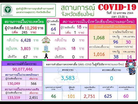 วันที่ 12 ม.ค. 64 ที่ศูนย์ข้อมูลข่าวสารเฉพาะกิจจังหวัดเชียงใหม่ อาคารอำนวยการ ศาลากลางจังหวัดเชียงใหม่ นายวีระพันธ์ ดีอ่อน รองผู้ว่าราชการจังหวัดเชียงใหม่ ร่วมกับ ดร.ทรงยศ คำชัย หัวหน้ากลุ่มงานควบคุมโรคติดต่อ สำนักงานสาธารณสุขจังหวัดเชียงใหม่ ร่วมกันแถลงข่าวผลการประชุมคณะกรรมการโรคติดต่อจังหวัดเชียงใหม่และสถานการณ์การแพร่ระบาดโรคติดเชื้อไวรัสโคโรน่า 2019 ประจำวันที่ 12 มกราคม 2564นายวีระพั