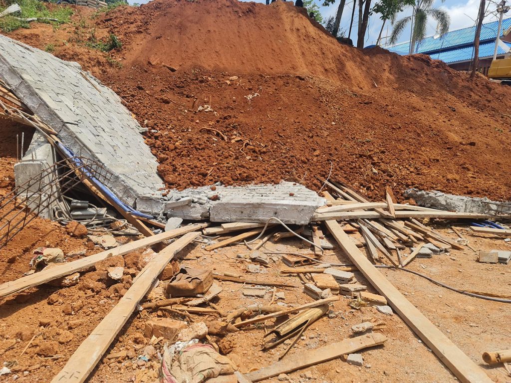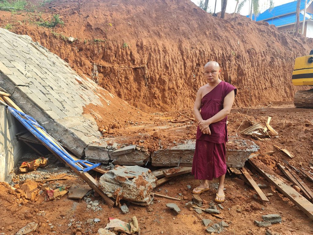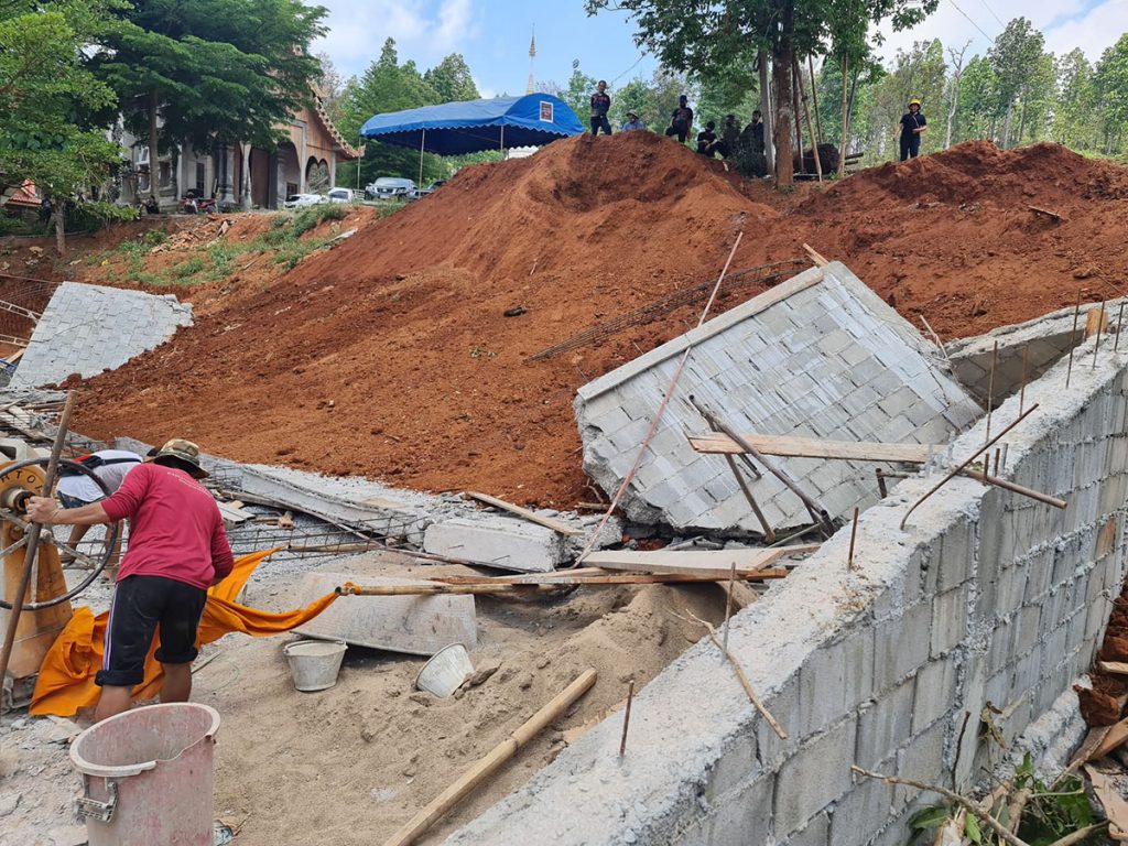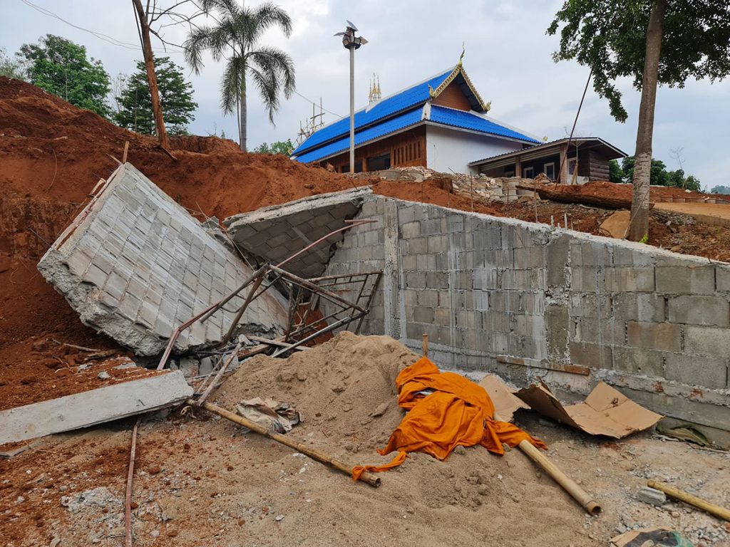 พระครูเกษมจริยานุกูล (ครูบากิตติชัย) เจ้าอาวาสวัดปางมะกง กล่าวว่า เมื่อช่วงบ่ายของวันที่ 19 เม.ย. ที่ผ่านมา ได้เกิดมีพายุฝนตกลงมาอย่างหนัก ซึ่งวัดแห่งนี้อยู่บนดอย และอยู่ในพื้นที่ห่างไกล โดยวันที่เกิดเหตุทางวัดก็กำลังประกอบพิธีทางศาสนาให้กับผู้เสียชีวิตเป็นศพอนาถา ขณะที่กำลังประกอบพิธีอยู่นั้น ก็มีฝนตกลงมาอย่างหนัก แต่โชคดีช่วงที่ประกอบพิธี ไม่มีใครอยู่บริเวณใกล้เคียงสถานที่ก่อสร้าง และไม่มีใครนำรถไปจอดบริเวณใกล้เคียง หลังจากที่พายุฝนตกลงมาและมีลมพายุแรง ทำให้โครงสร้างของอาคาร และนั่งร้านที่ก่อสร้าง พังลงมาทั้งหมด